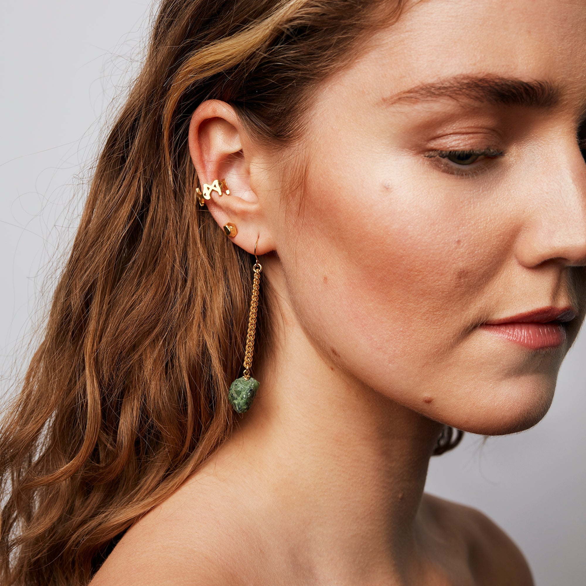 Green light with a rebel streak. Raw ruby zoisite drops — lush green shot with ruby sparks — bring colour and confidence in one clean line. These ruby zoisite drop earrings play beautifully with all-black tailoring or a clean column dress; tuck hair back and let the colour run the show.