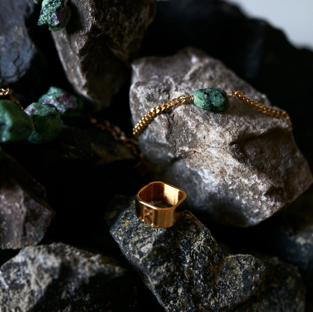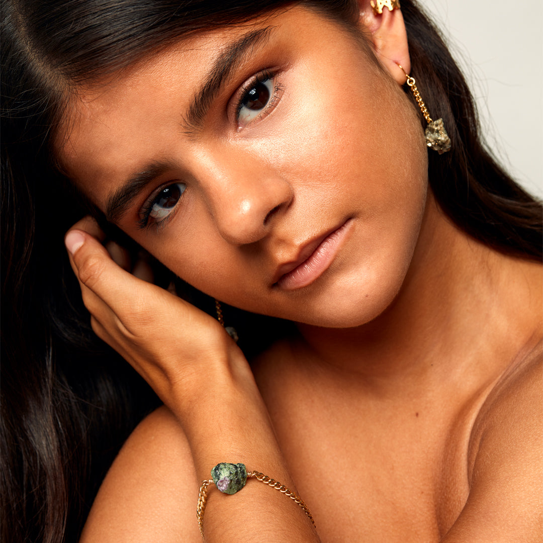Green with ruby flashes, concise and confident. This bracelet centres a raw ruby zoisite on a diamond cut curb chain — modern, grounded, and a clean dose of colour for everyday rotation.