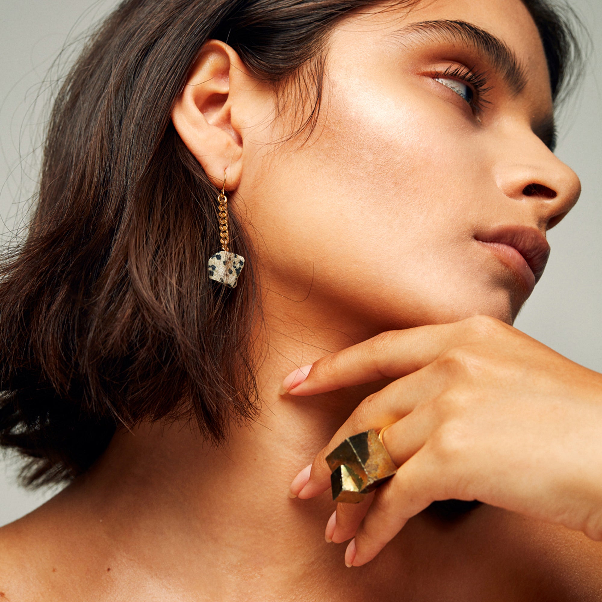 Graphic by nature, modern by design. Dalmatian stone drop earrings bring cream-and-black contrast in a lean silhouette — striking without shouting. Pair with neutral tailoring or a leather jacket and let the pattern do the work.
