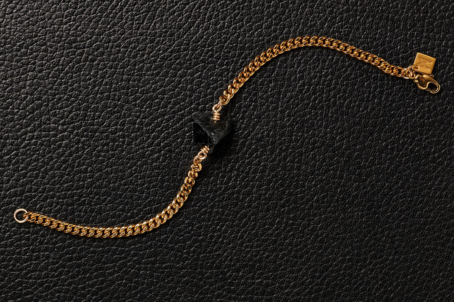 Black tourmaline with quiet authority. Centred on a polished curb chain, this bracelet reads lean and decisive — the one that makes off-duty tees look intentional and evening looks a touch less polite.