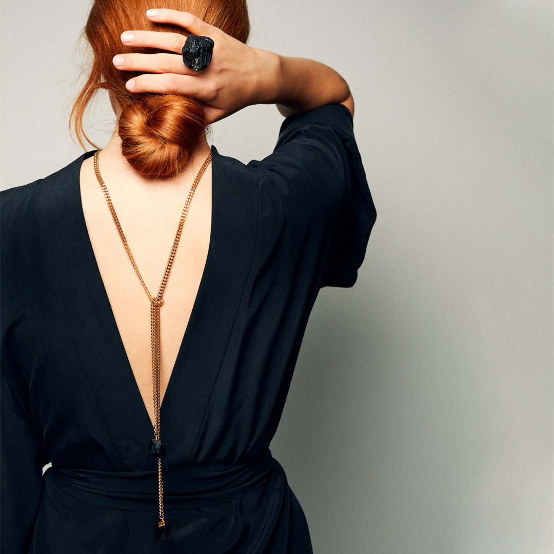 Raw black tourmaline on a clean band — wearable art with real presence. Made for bold dressers who like their luxury with edge; the ring you reach for for big meetings, gallery nights or late-hour mischief. Natural texture keeps it modern, confident, unmistakably you.
