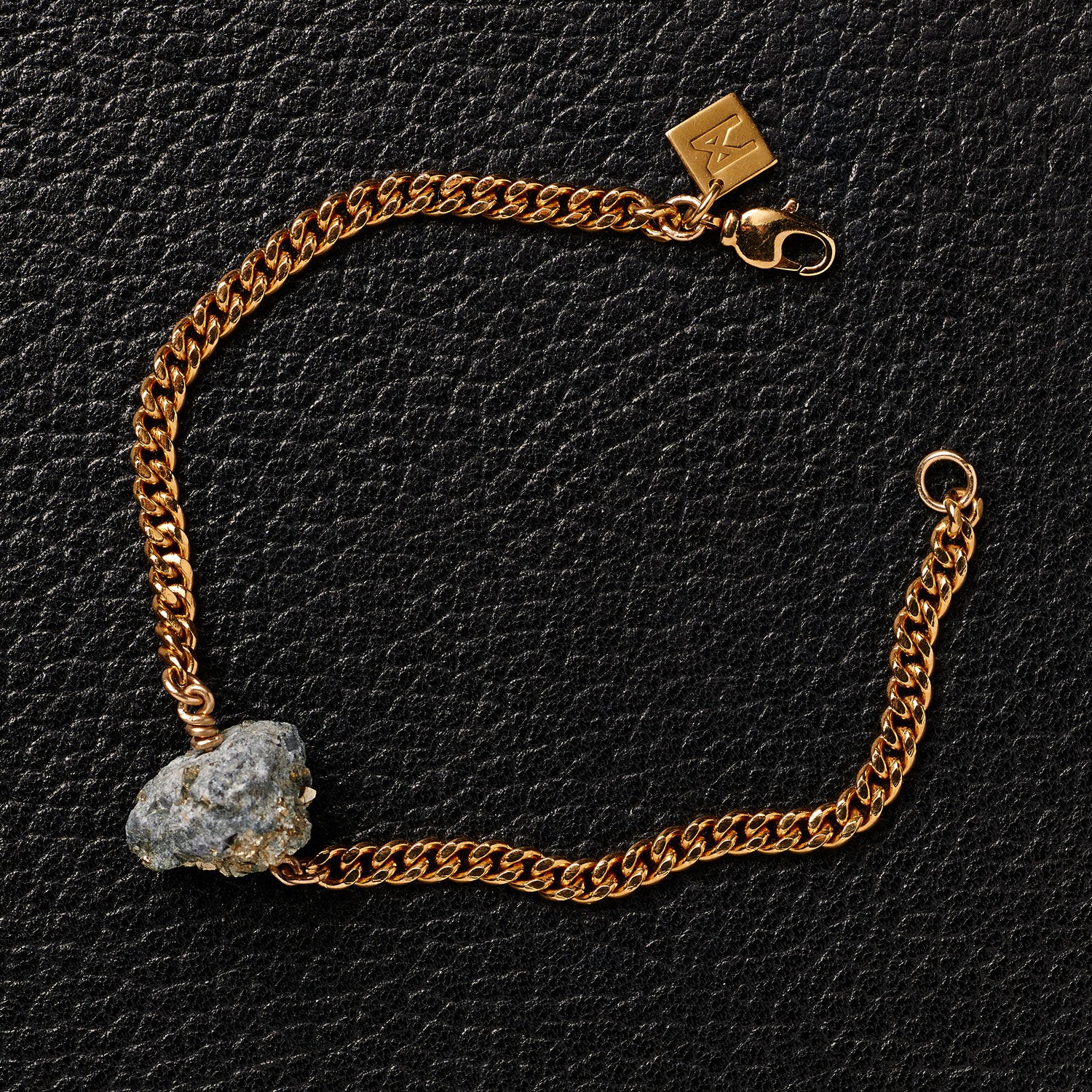 Two characters, one stone. This bracelet centres raw calcite naturally fused with pyrite on a polished curb chain — soft tone meets mineral power in a clean, modern contrast. Easy with a white tee; unexpectedly sharp with satin.