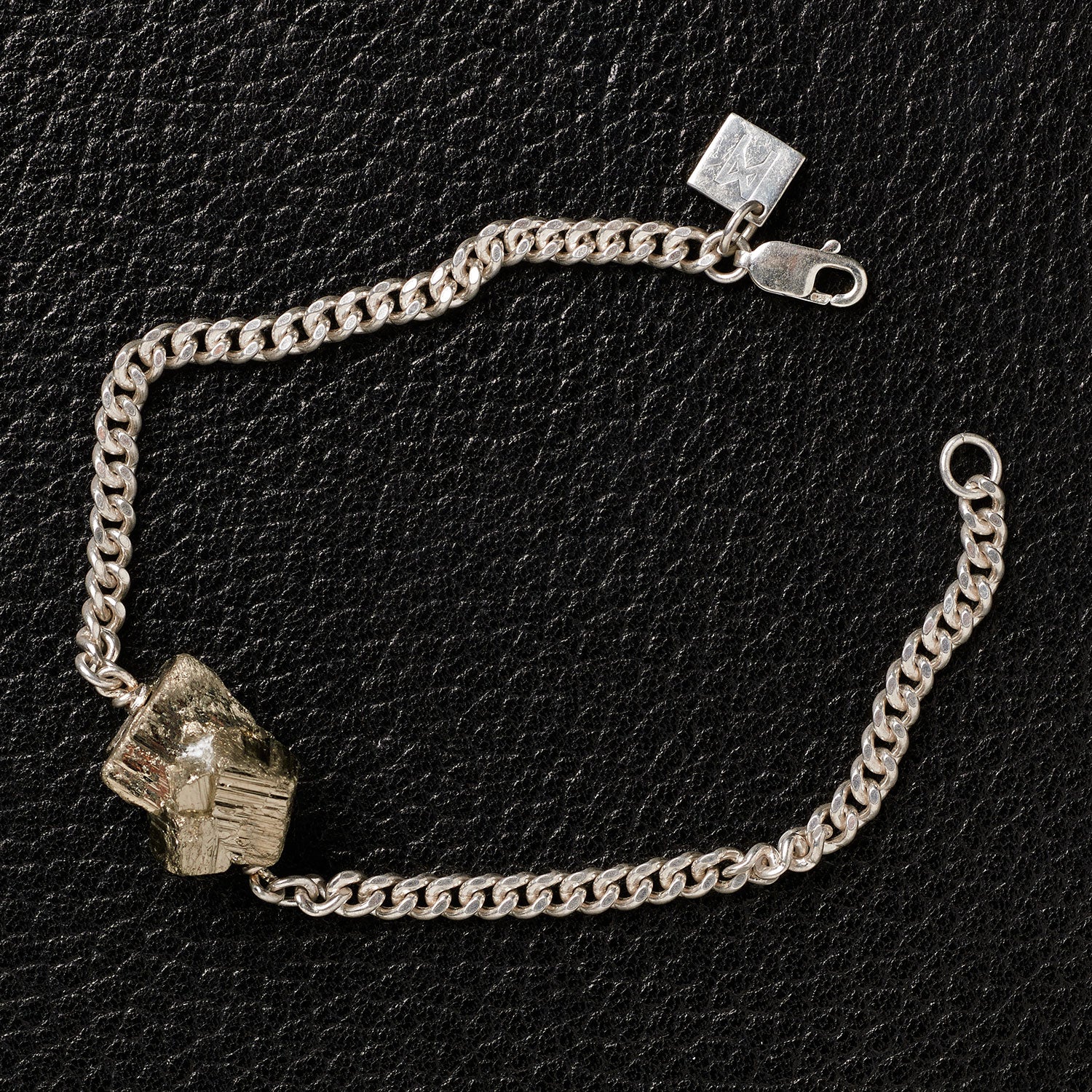 Shiny pyrite on a polished bracelet curb chain — compact flash, serious intent. Think mirror-bright mineral with a sly grin: switches on basics by day, turns up the voltage after dark.